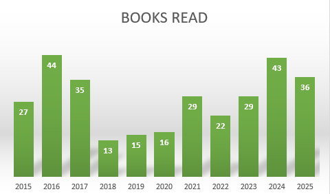 From 2015 to 2025 I have read 309 books (they would definitely fill a library shelf), for a total of 97629 pages. Here’s a couple of graphs for the visual people. Although I did read a good number of books in 2016, if you look at pages read, my most prolific years were the last 3, with more than a thousand pages per month read.